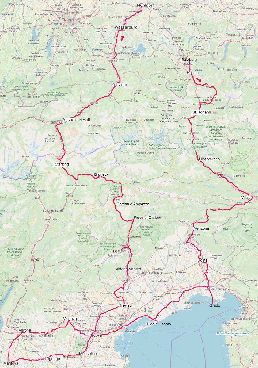 Wir folgten auf der Hinfahrt weitgehend dem Alpe - Adria - Radweg. Ein großer Teil der Rückfahrt erfolgte auf dem München - Venezia - Radweg in umgekehrter Richtung.