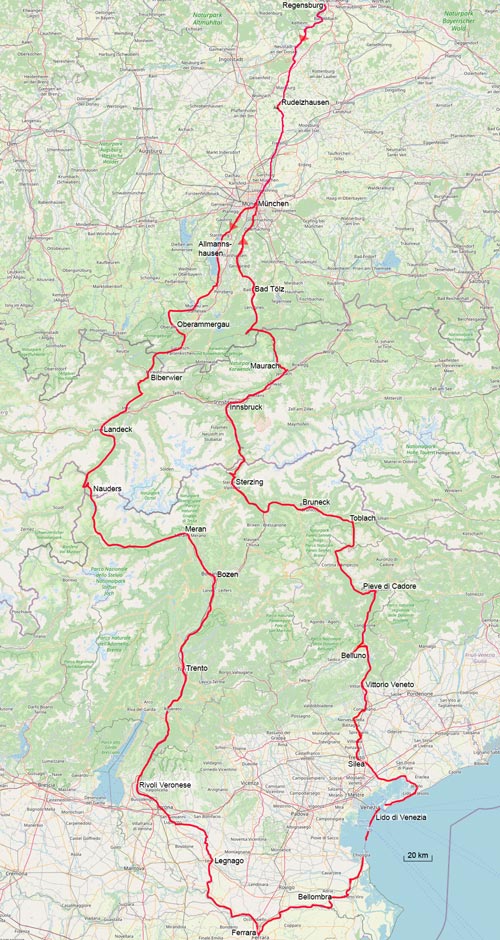 Mit der Fähre kamen wir von Chioggia zum Lido di Venezia. Weiter ging es mit der Fähre nach Jesolo. Heim fuhren wir durch die Dolomiten und über den Brenner, ab München mit der Bahn.